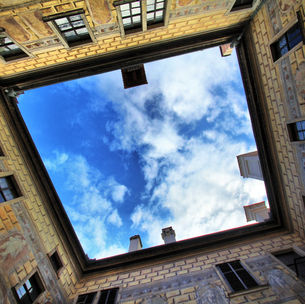 We crossed the bridge at the south end of town and entered the narrow, cobblestone streets lined with colorful, buildings on either side. If you look closely, it is easy to see parts of the original building from the Renaissance period still in use and well preserved. Many of the buildings have original paintings of people, animals, and even pseudo brickwork on the outside. These are done utilizing a unique technique where the artist would put down a layer of paint, cover it with another, and then scratch through to create the image. A nearby (tourist) horse carriage along with the smell of baking bread almost transported us back to the Middle Ages. The old town is very walkable, and I highly recommend this as the way to explore. There are a myriad of small shops, restaurants, bars, and boutiques tucked away into narrow streets or on the banks of the river. The pace of life is instantly slowed, and it is a beautiful feeling to just take in the imagery. Given it was fall, many of the trees were in radiant hues of yellow, orange, and red. We spent the morning exploring the streets before making our way to the castle.