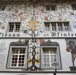 The architecture and artwork on the outside of buildings are two things that add to the uniqueness of Lucerne. The best example of architecture is the imposing Jesuit Church which was built in 1677 and is the first large Baroque church in Switzerland. It’s inside is richly decorated with many paintings and reliefs on the ceiling. Just across the river there are squares (Weinmarkt, Hirschenplatz, and Kornmarkt) that are filled with old buildings that have fresco paintings on the outside. There are many small, eclectic shops and restaurants here and provide a place for some lazy afternoon photography and people watching.